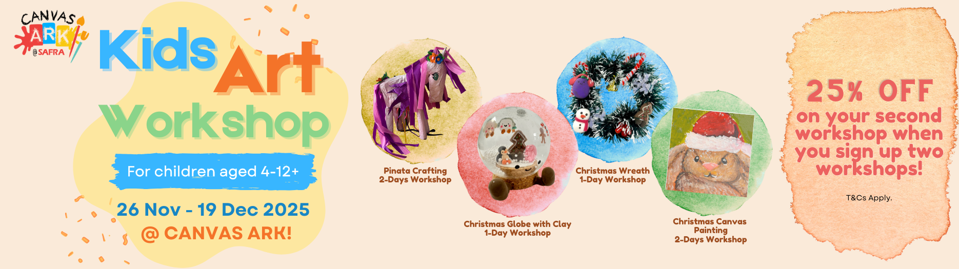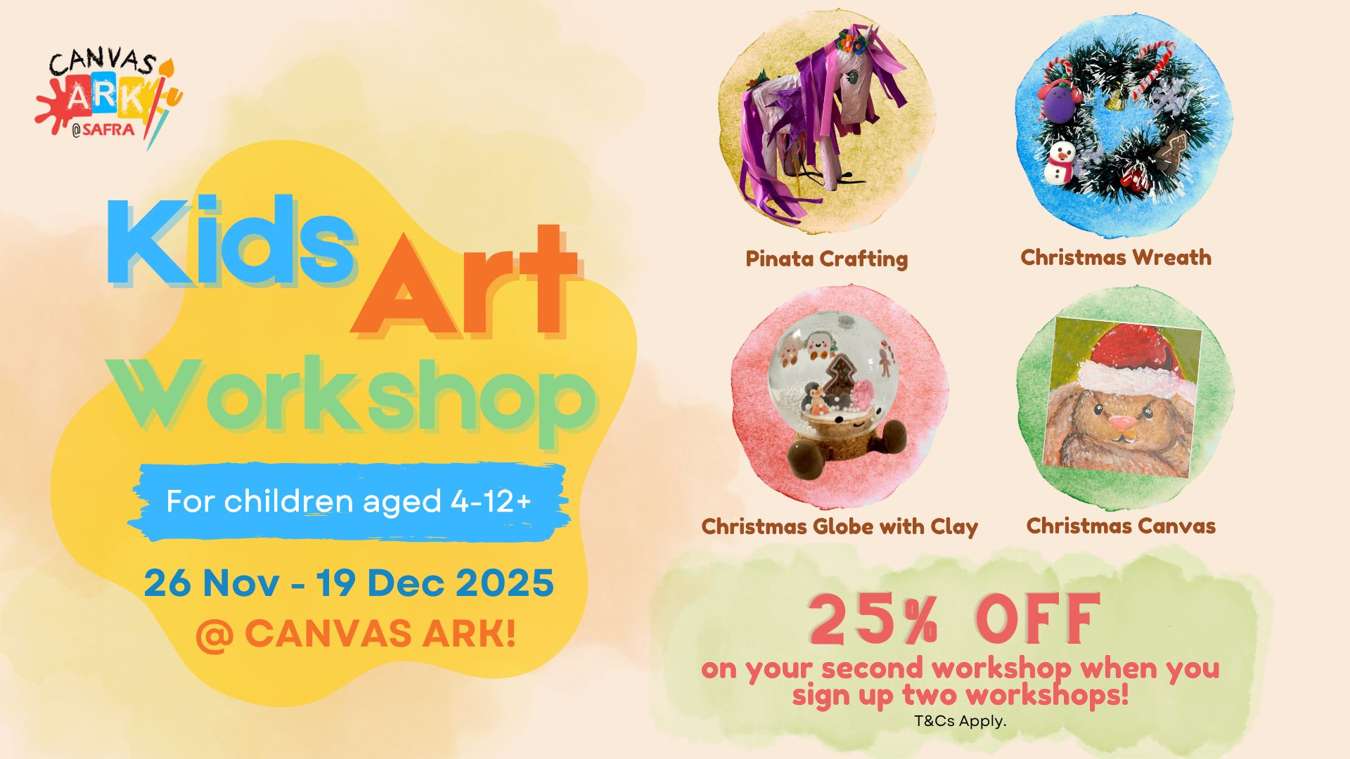 Join our creative and fun-filled workshops at Canvas Ark! Dive into our exciting festive-themed art workshops. Kids can craft and design their own piñatas, Christmas globe, Christmas wreath, & Christmas canvas masterpiece. A joyful experience perfect for this holiday.