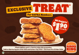 What's more, from 19 - 22 Mar 2026, SAFRA members are in for a treat! Enjoy BK Nuggets® (6pcs) at only $1.90 (U.P. $6.75). Flash your SAFRA card/e-card upon ordering at the counter, only at Marina Square (#02-105) or Suntec City (#03-371) stores.