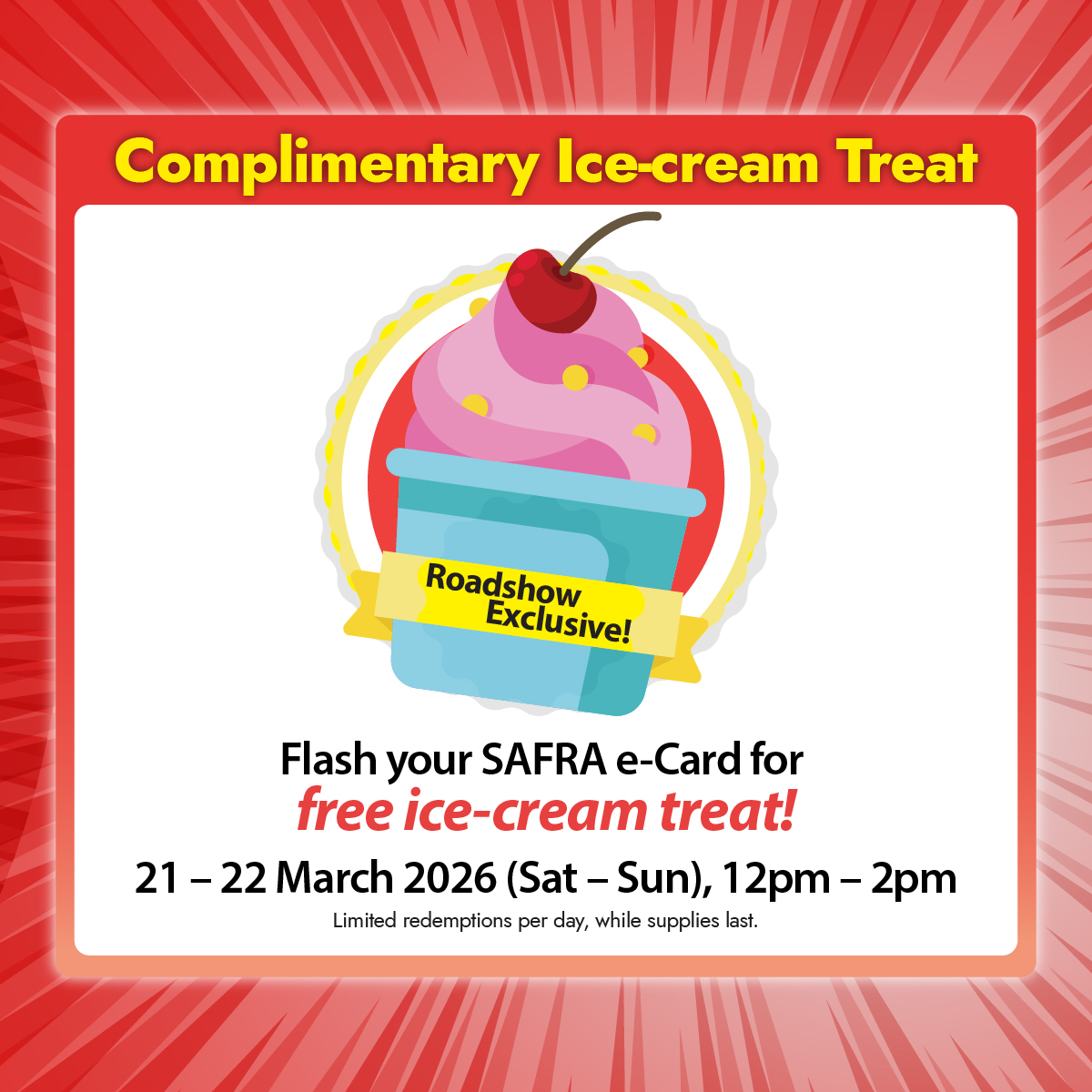 Flash your SAFRA card/e-card and redeem a complimentary ice-cream, valid on 21 & 22 March 2026 (Sat-Sun), 12pm-2pm.