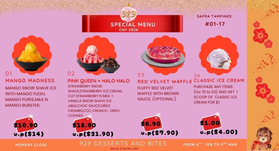 Please be informed that 929 Dessert & Bites will be closed from 14 to 21 Feb 2026. Business will resume as usual from 22 Feb 2026 onwards.