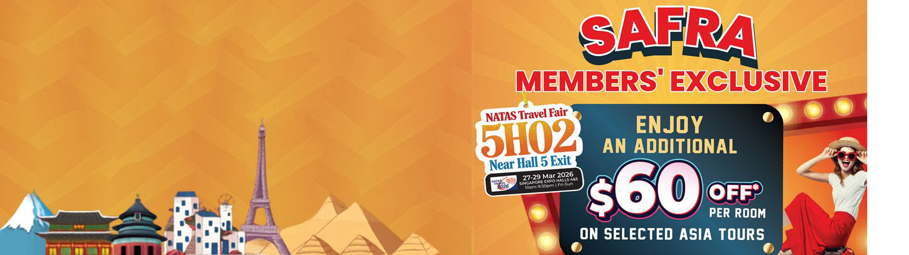 *Valid only for new bookings of group tour packages and is applicable exclusively to SAFRA members who are part of the travelling party. Eligible destinations include China, Japan, Taiwan, and Korea, subject to availability. Refer to the EU Holidays NATAS flyer here for available packages to these destinations and check with EU Holidays staff to confirm eligible tours. Promotion is stackable with ongoing NATAS promotions, unless otherwise specified by EU Holidays.