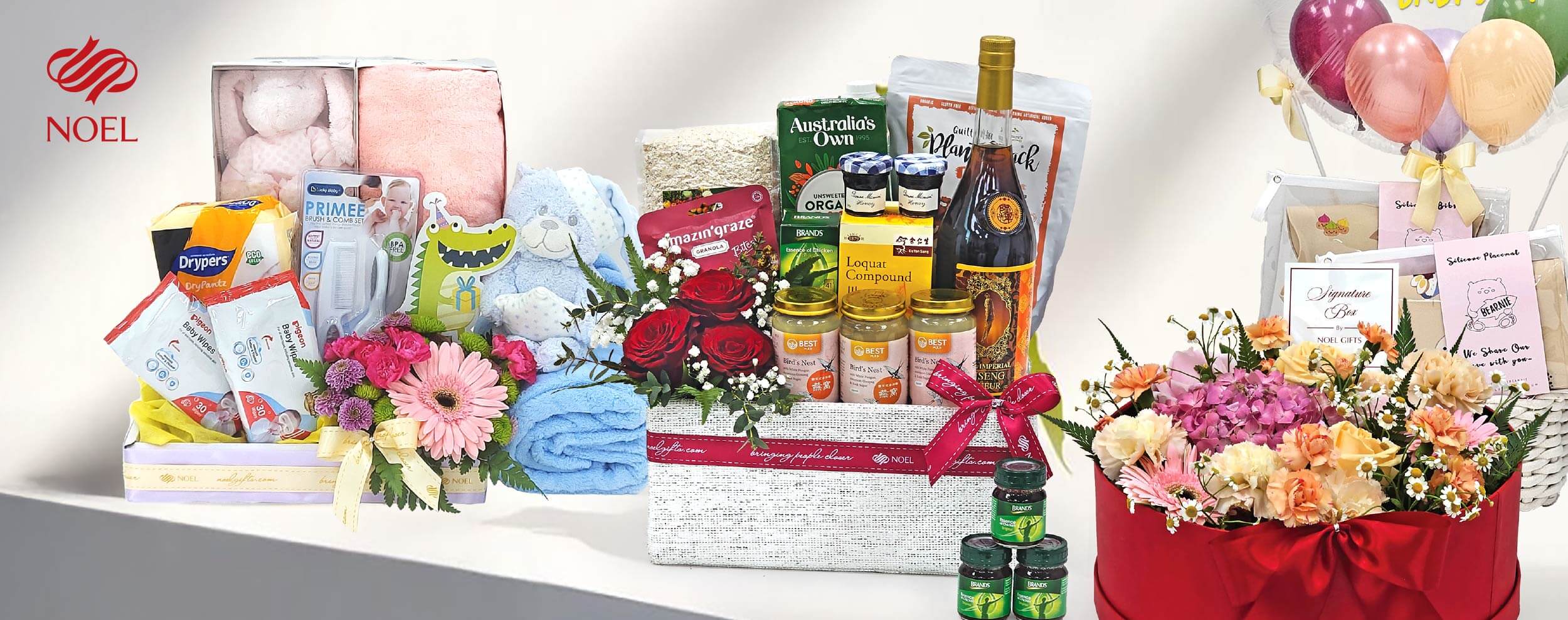 Noel Gifts is the leading hampers, flowers and gifts company with an extensive offering of chic floral arrangements and gifting ideas for the stylish and discerning. Its core competencies extend beyond floral arrangements and include conceptualising, designing, sourcing, packaging finesse and delivery of gifts. Since its establishment in 1975, Noel Gifts remains true to its core value, and continues living its vision of "Bringing People Closer, Making Everyday Better".
