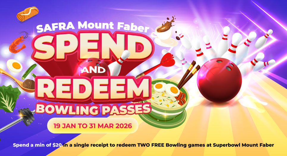 From 19 January 2026 to 31 March 2026, SAFRA members who spend a minimum of $20 (before 9% GST, service charges, and discounts) in a single transaction at any SAFRA Mount Faber facility or vendors may redeem a pass for 2 free Superbowl Bowling Games at the Customer Service Counter.