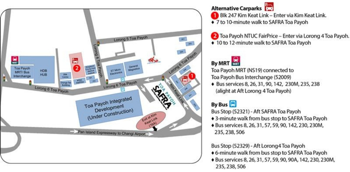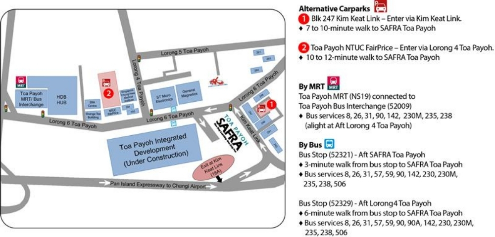 On the day of the AGM, complimentary parking at SAFRA Toa Payoh will be made available to SAFRA members who attend the AGM. Parking coupons can be collected when you register your attendance onsite.