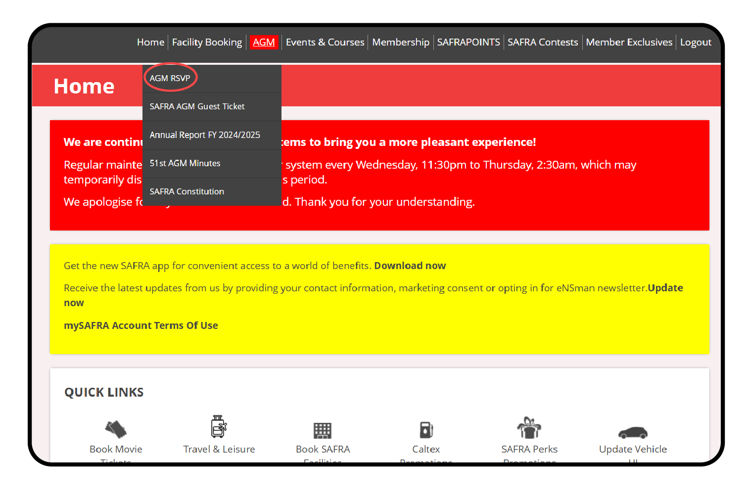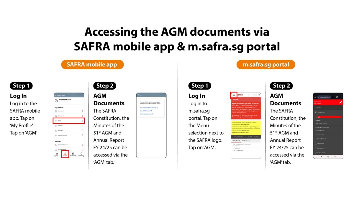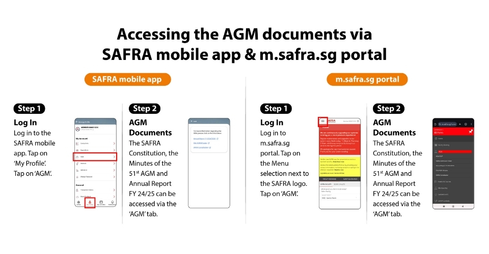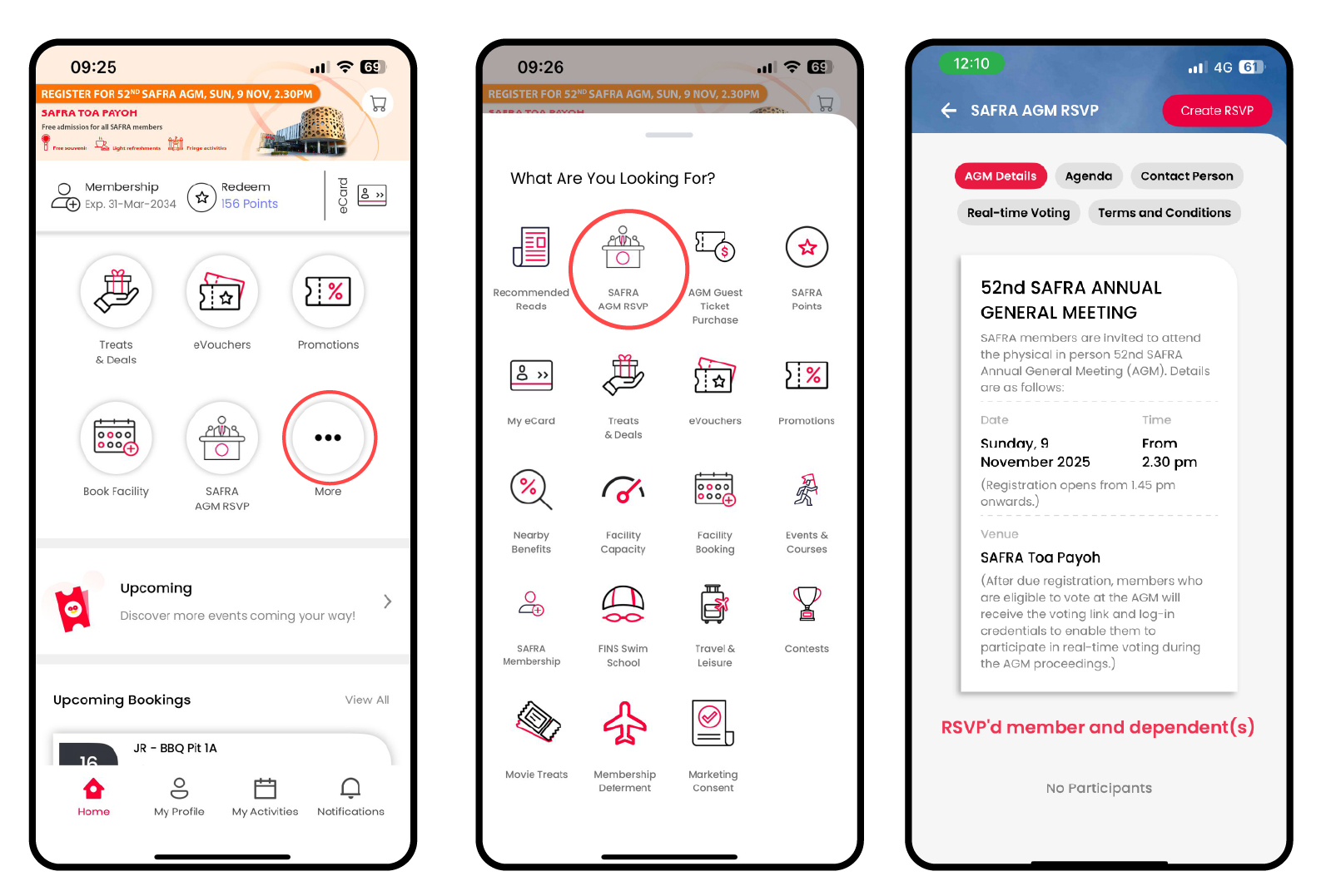 Register now by logging into your SAFRA account via the SAFRA mobile app or m.safra.sg portal under the ‘AGM RSVP’ tab, as seen in the screenshots below.