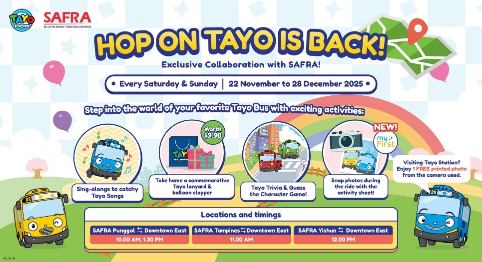 SAFRA is thrilled to announce the return of the Hop On Tayo Bus this festive season, in partnership with Tayo Station! SAFRA members get exclusive discounted rates and can catch the Hop On Tayo Bus at SAFRA Punggol, SAFRA Tampines and SAFRA Yishun.