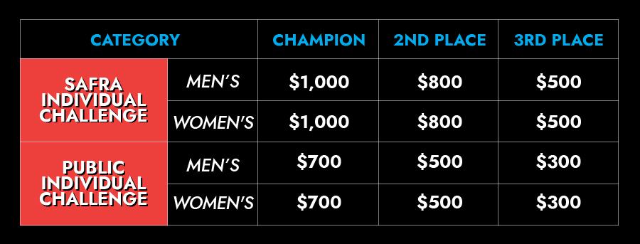 | INDIVIDUAL CHALLENGE (MEN'S/ WOMEN'S) | $50 per pax | $100 per pax |