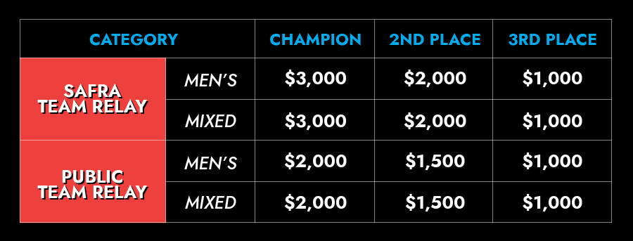 TEAM RELAY* (MEN'S/ MIXED) *5 pax per team | $100 per Team | $200 per Team |