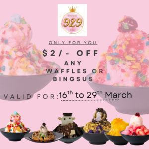 ![]() | Enjoy $2 off waffles or bingsu! Vendor: 929 Desserts & Bites Promotion Date: 16 to 29 Mar 2026 Click here to find out more. |