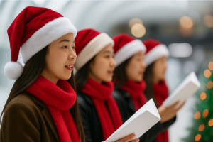 Acapella carollers with their harmonious voices perform classic seasonal songs without any instrumental accompaniment, showcasing their vocal talent and creating a timeless, enchanting sound to evoke the warmth and spirit of the holiday season, filling the air with joy and nostalgia. Acapella Carollers & Toy Soldier