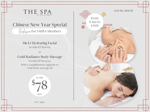 ![]() | Enjoy 60mins Mu Er Hydrating Facial at $78nett OR 90mins Gold Radiance Body Massage at $78nett Club: SAFRA PunggolOutlet: The Spa by The Ultimate Promotion Period: 06 Jan to 06 Feb 2026 Click here for more information. |