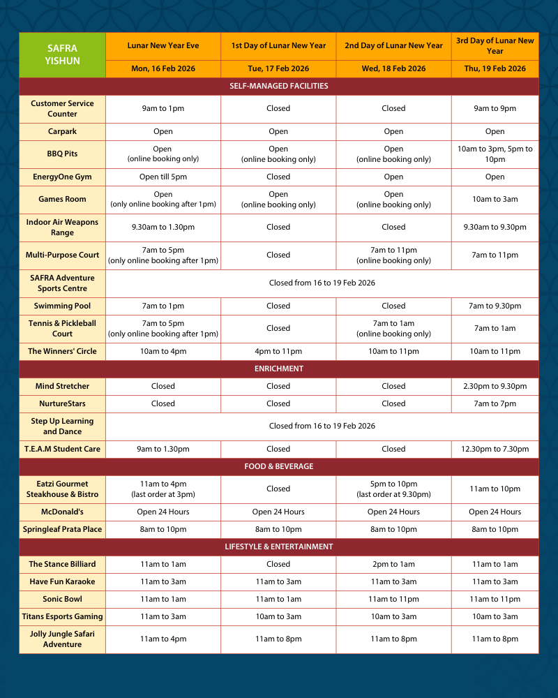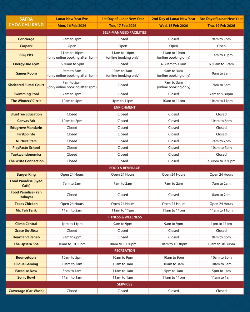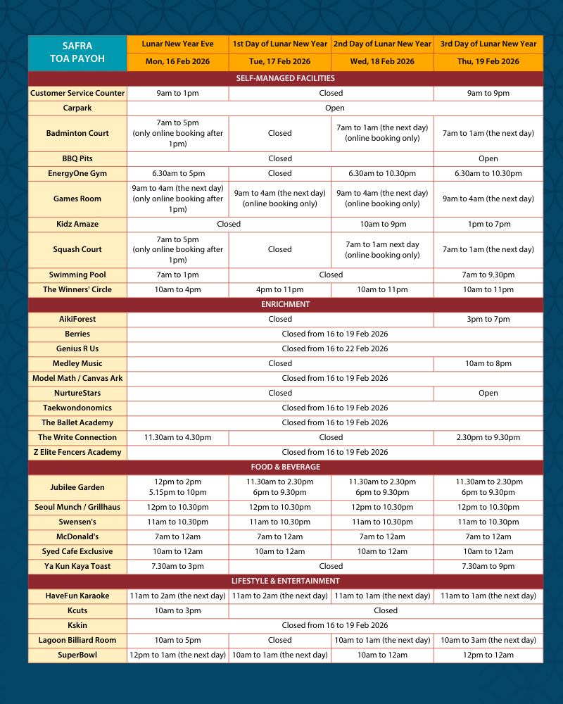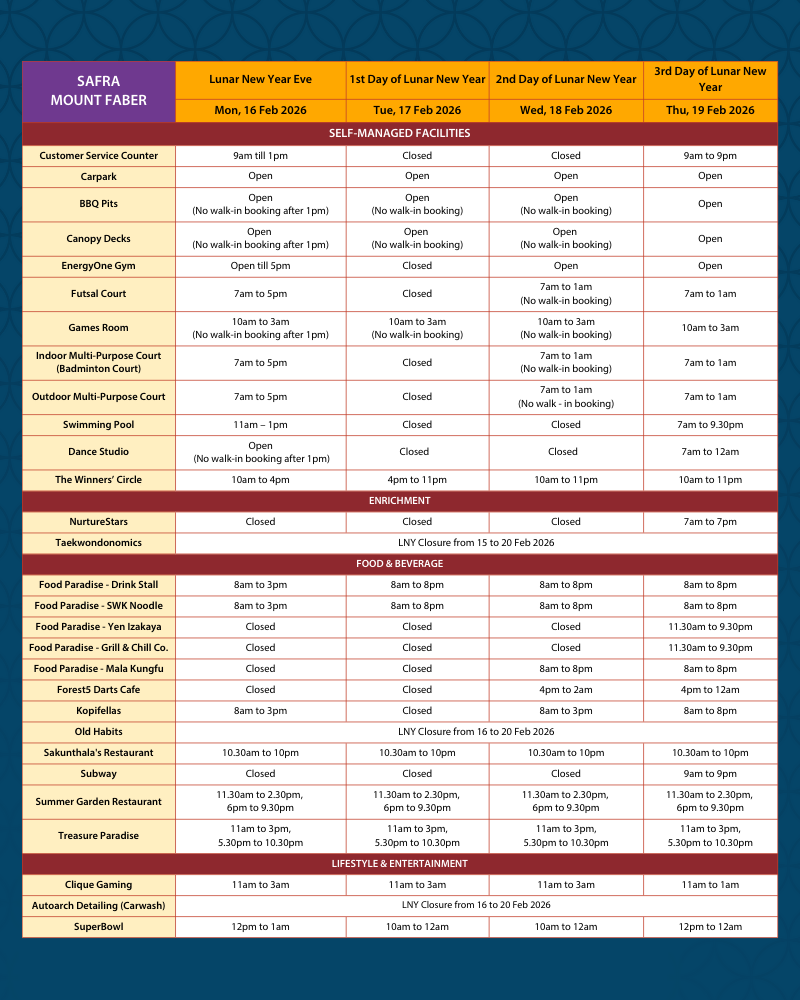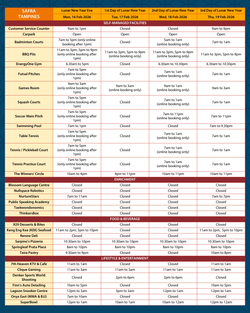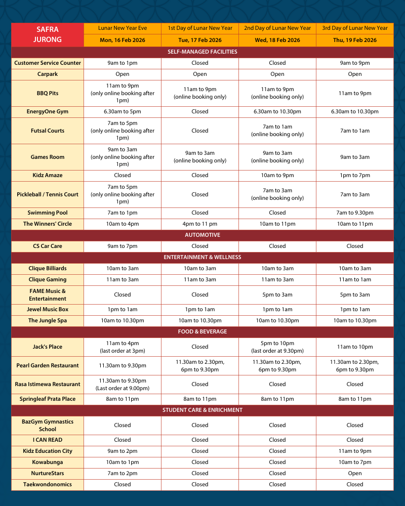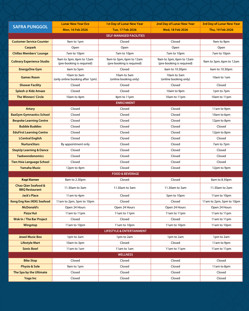 Please refer to below Lunar New Year operating hours for your planning when you come by to celebrate the festivities with us!