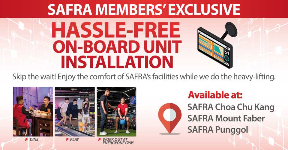 Exclusively for SAFRA members, enjoy hassle-free On-Board Unit (OBU) installation at SAFRA Punggol, SAFRA Choa Chu Kang, and SAFRA Mount Faber.