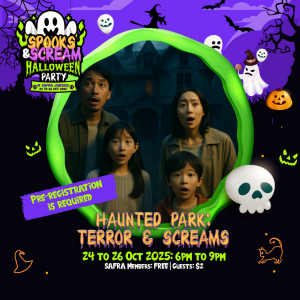 Pre-registration for the Haunted Park: Terror & Screams will be from 3 October to 25 October 2025 at SAFRA Jurong's Customer Service Counter, SAFRA Mobile App or MySAFRA Portal.