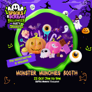 Pre-registration for the Monster Munchies Booth will be from 30 September to 25 October 2025 at SAFRA Jurong's Customer Service Counter, SAFRA Mobile App or MySAFRA Portal.